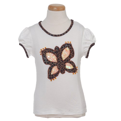 A super stylish shirt for your little girl by Lipstik. Ivory shirt has leopard hem at the neck and capped sleeves. Decorated with a leopard print butterfly highlighted with orange beads. This shirt would look great paired with leggings. A fabulous addition to her summer wardrobe.